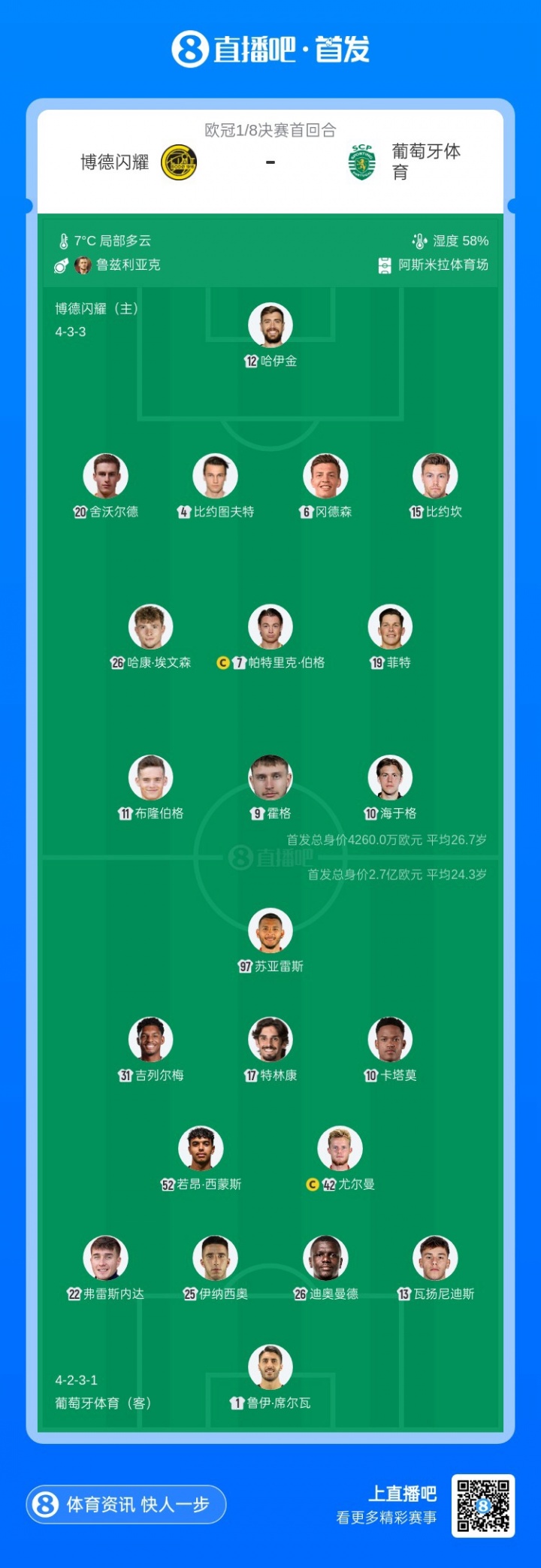 直播吧3月12日訊 歐冠1/8決賽首回合,博德閃耀對(duì)陣葡萄牙體育,賽前首發(fā)公布。