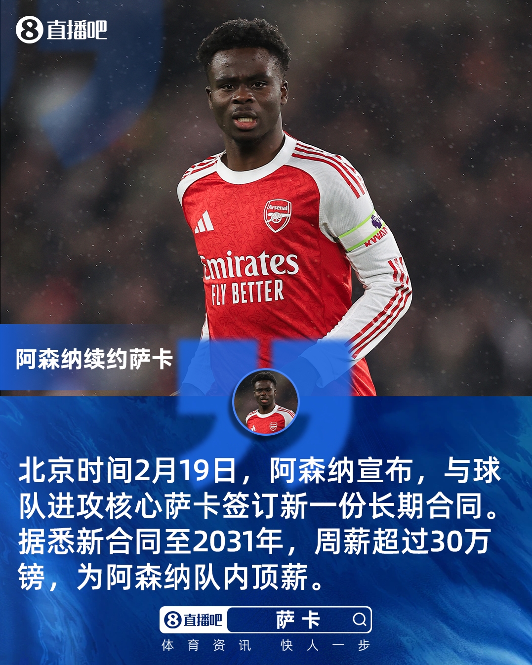 在上個(gè)月,阿森納剛剛與薩卡續(xù)約至2031年,據(jù)媒體報(bào)道,薩卡的新合同周薪超過(guò)30萬(wàn)鎊,是隊(duì)內(nèi)的頂薪。