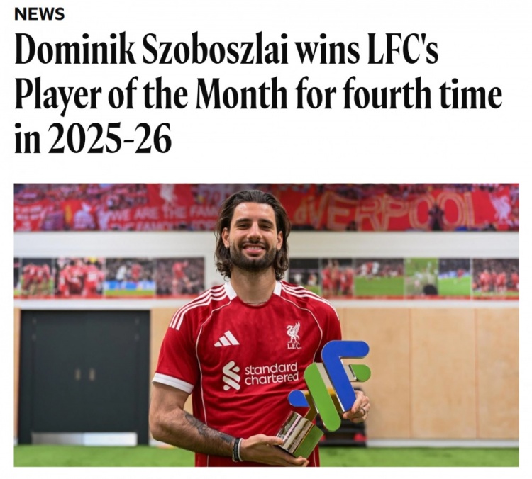 在月最佳評(píng)選中,索博斯洛伊獲超過三分之一的選票。繼去年8月、10月、11月之后,這名中場(chǎng)本賽季第四次獲此榮譽(yù)。