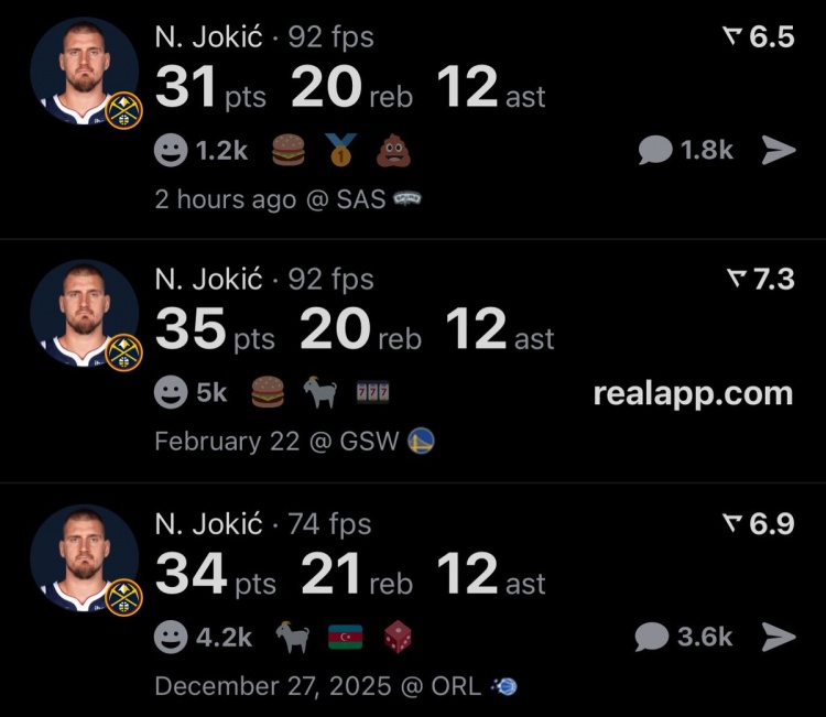 據(jù)統(tǒng)計,本賽季至今,全聯(lián)盟只有約基奇打出過單場至少30分20籃板10助攻的表現(xiàn),而且他做到了3次!