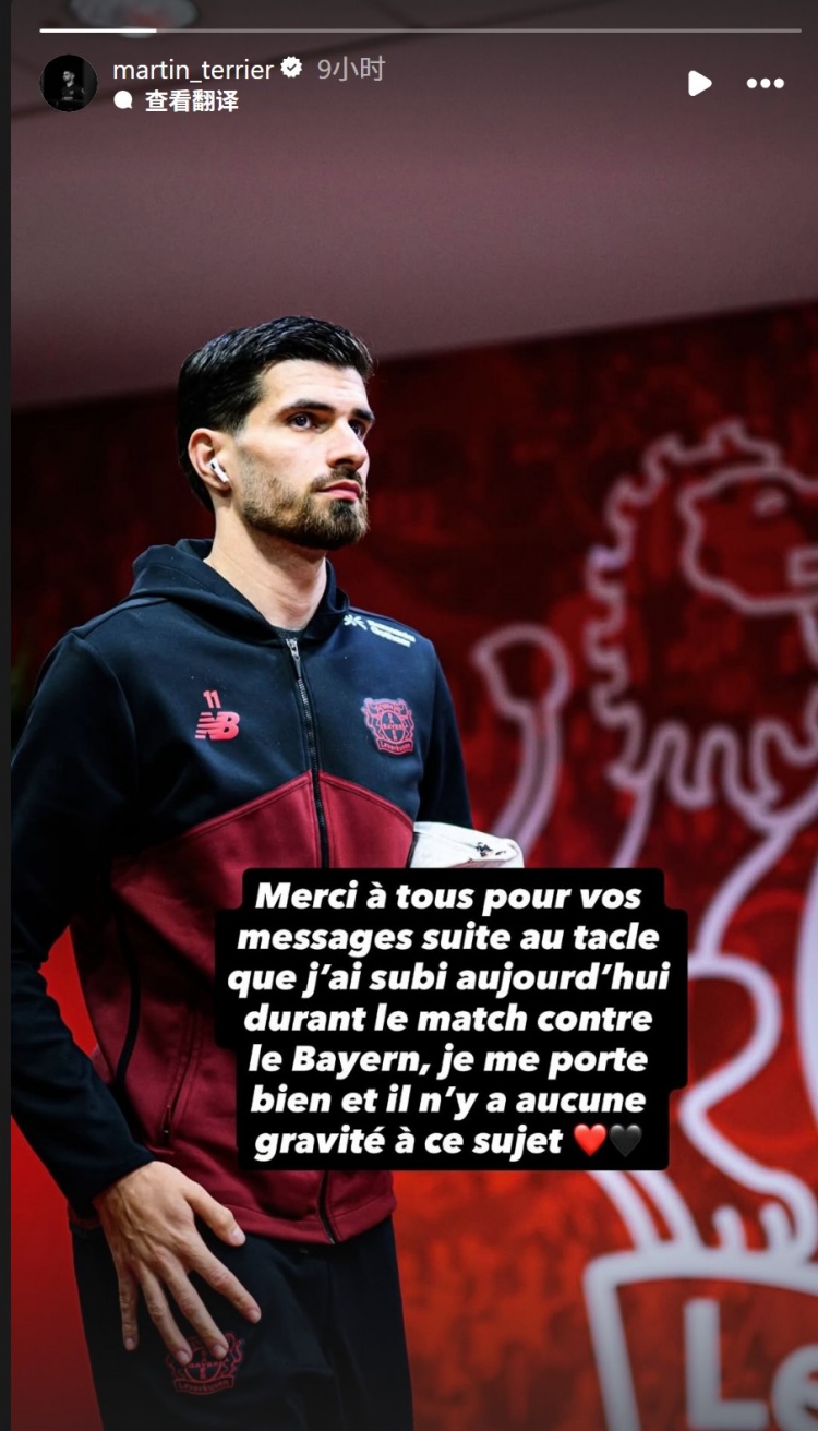 泰里耶社媒報平安,他寫道:“感謝大家在我今天對陣拜仁的比賽中被鏟球后發(fā)來的關(guān)心問候,我目前感覺良好,傷勢沒有大礙?!?/p>
