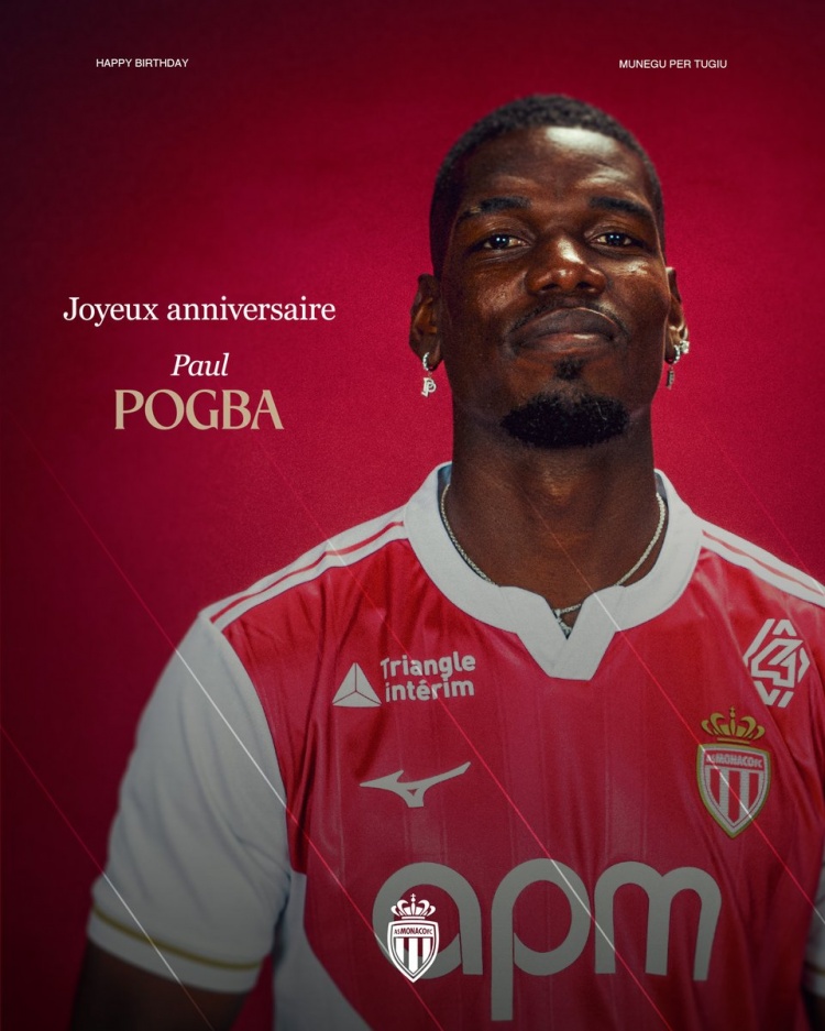 摩納哥官方社媒曬出博格巴的生日海報,配文:“博格巴今天迎來了他的33歲生日,祝你生日快樂!”