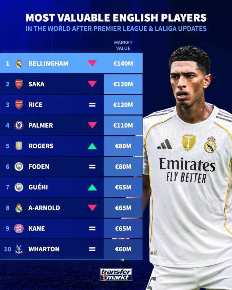 直播吧3月16日訊 在公布了新一期的西甲球員身價(jià)情況后,德國(guó)轉(zhuǎn)會(huì)市場(chǎng)盤點(diǎn)了英格蘭球員身價(jià)top10,貝林厄姆以1.4億歐居首,阿森納兩將薩卡和賴斯以1.2億歐并列次席。