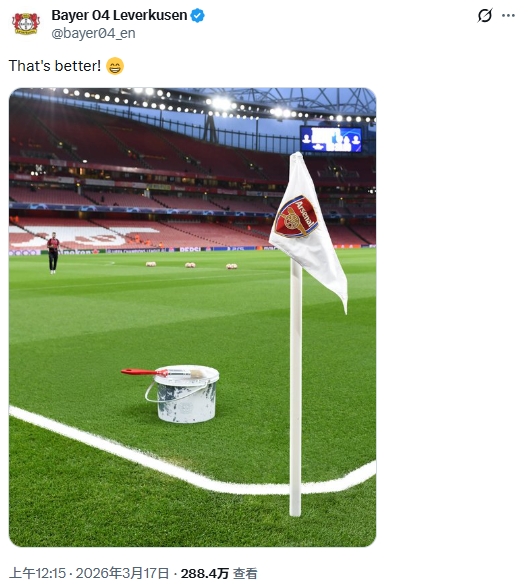 勒沃庫森官推今日曬P圖,將球場劃線更改,并將角旗P上了阿森納logo。同時寫道:“這樣更好”