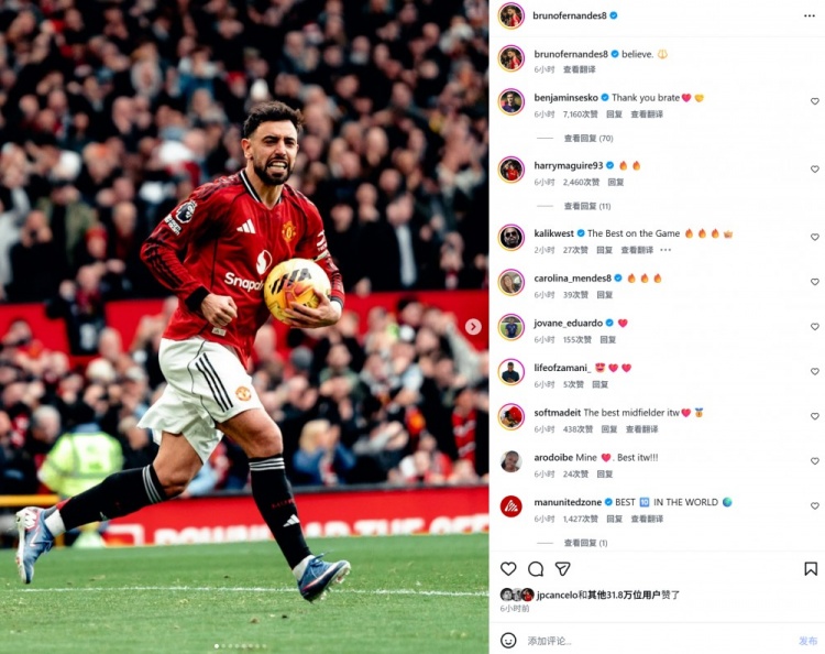 本場比賽B費傳射建功,賽后他也在個人社媒曬出慶祝照片,配文寫道:“紅魔信念!”本場比賽接B費助攻破門的舍什科也評論道:“感謝兄弟。”