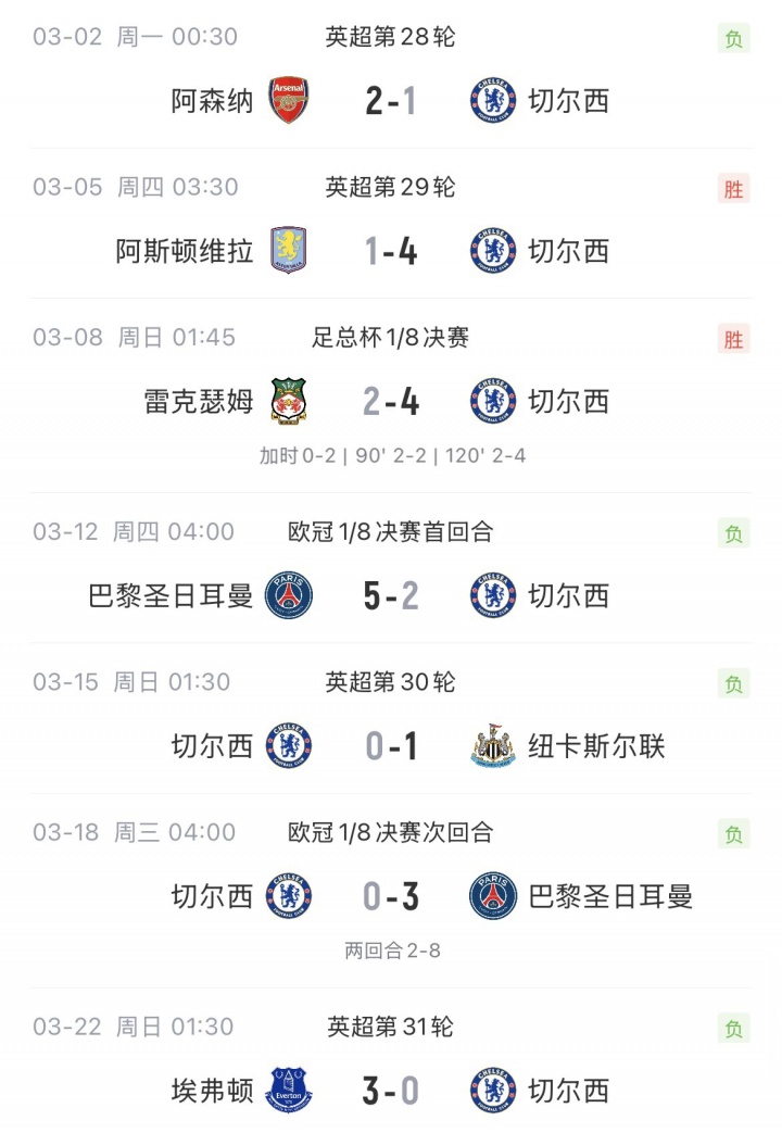 二月份,切爾西共出戰(zhàn)6場(chǎng),取得3勝2平1負(fù)的戰(zhàn)績(jī)。三月份,切爾西各賽事2勝5負(fù),歐冠2-5、0-3慘敗巴黎出局。