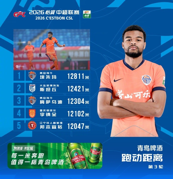 直播吧3月22日訊 中超聯(lián)賽第三輪跑動(dòng)距離榜公布,海牛外援埃朱馬跑動(dòng)距離達(dá)到12811米,成功登頂本輪跑動(dòng)距離榜。