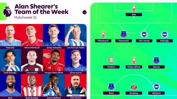 直播吧3月23日訊 英超第31輪戰(zhàn)罷,阿蘭·希勒評選了本輪最佳陣容,貝托、吉布斯-懷特、維爾貝克在列。