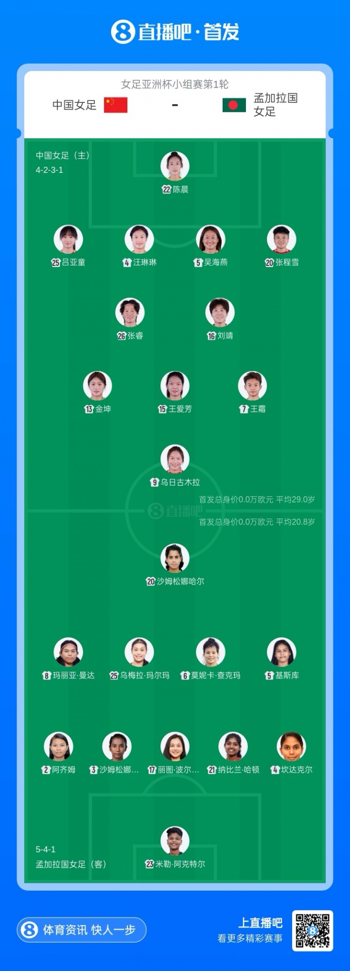 直播吧03月03日訊 2026年澳大利亞女足亞洲杯小組賽,中國(guó)女足vs孟加拉國(guó)女足首發(fā)出爐。這是中國(guó)女足本屆亞洲杯首場(chǎng)比賽,比賽在西悉尼體育場(chǎng)進(jìn)行。