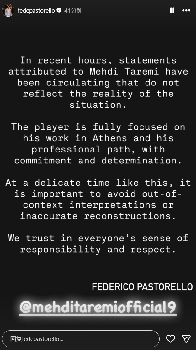 經(jīng)紀(jì)人費(fèi)德里科·帕斯托雷洛寫(xiě)道:“近期流傳的關(guān)于邁赫迪·塔雷米的言論不符合實(shí)際情況。這位球員正以承諾與決心,完全專(zhuān)注于他在雅典的工作和他的職業(yè)道路。