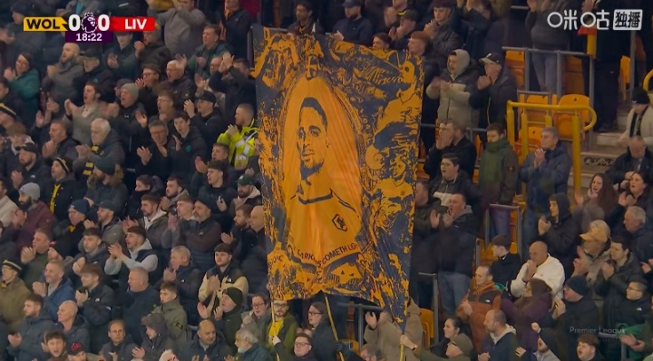直播吧03月04日訊 狼隊主場迎戰(zhàn)利物浦,第18分鐘,狼隊主場球迷集體鼓掌。18是若塔在狼隊時的號碼。
