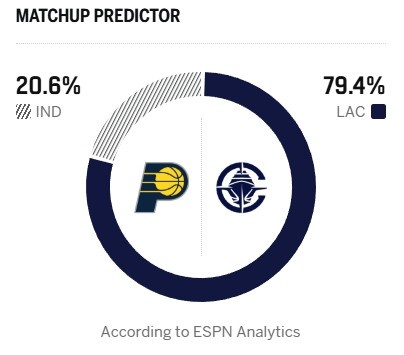 今日ESPN給出本場勝率預(yù)測,快船高達(dá)79.4%,步行者只有20.6%。