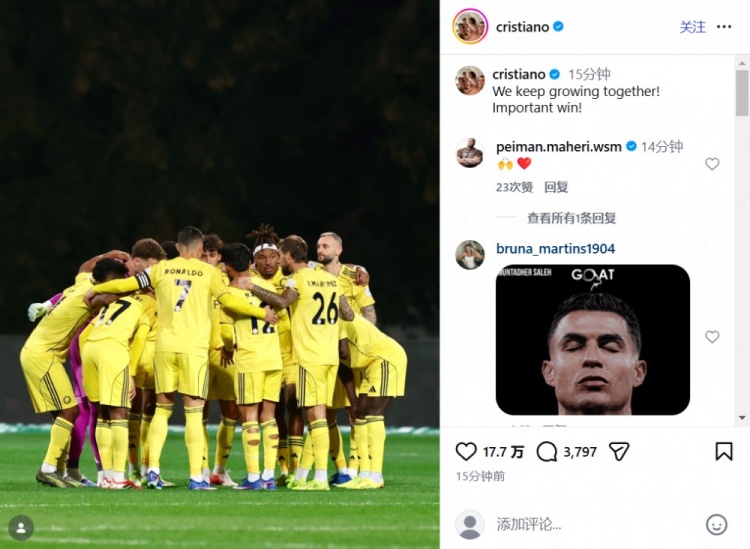 賽后,C羅在社交媒體上寫道:我們攜手共進(jìn),這是一場非常重要的勝利。