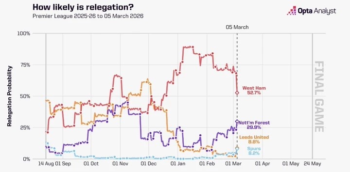 其中熱刺在賽季中期降級概率一直趨近于0,但是由于近期的糟糕表現,目前降級概率提升至8.2%。利茲聯(lián)在賽季前期降級概率偏高,目前只有8.8%,而諾丁漢森林目前則有29.9%,西漢姆在之前一度高達80%以上,但是近期的出色發(fā)揮已經降至52.7%。