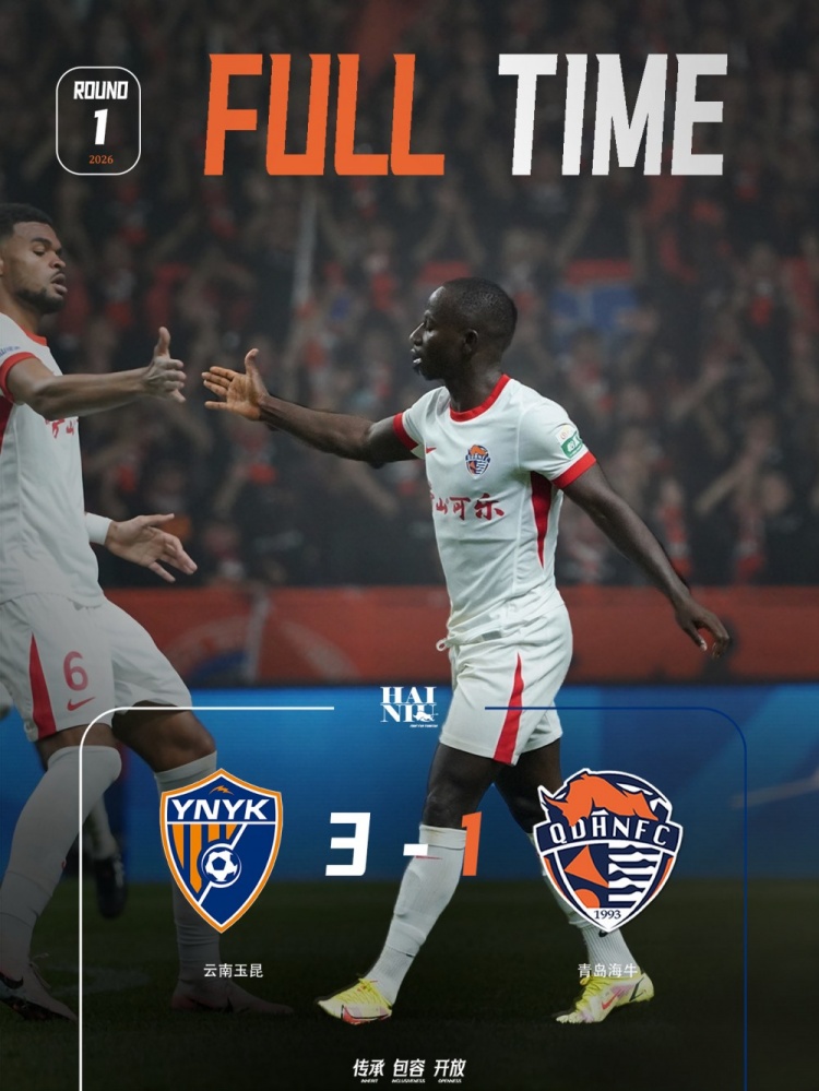 全場比賽結(jié)束,青島海??蛨?-3不敵云南玉昆。葉博亞為球隊(duì)打入新賽季首球。
