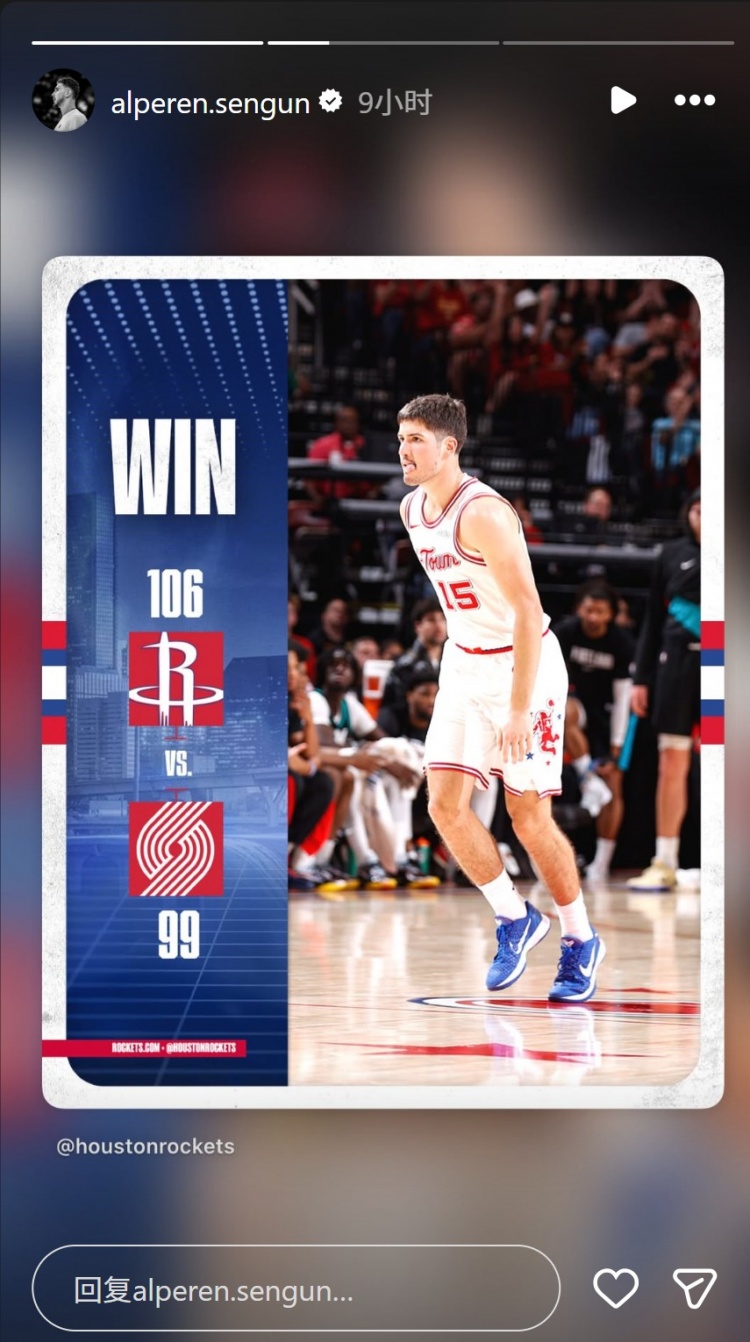 賽后申京在INS上轉(zhuǎn)發(fā)了本場(chǎng)火箭官方曬出的贏球海報(bào)和自己的數(shù)據(jù)海報(bào)。