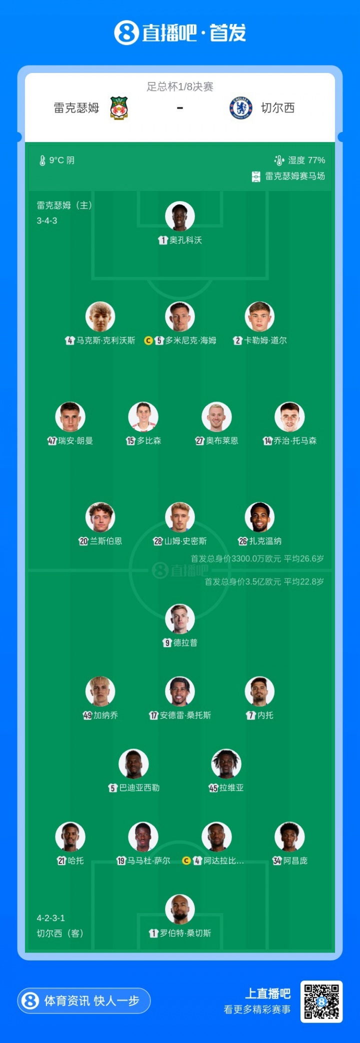 直播吧3月8日訊 足總杯1/8決賽,切爾西客場對陣雷克瑟姆,賽前首發(fā)名單公布。