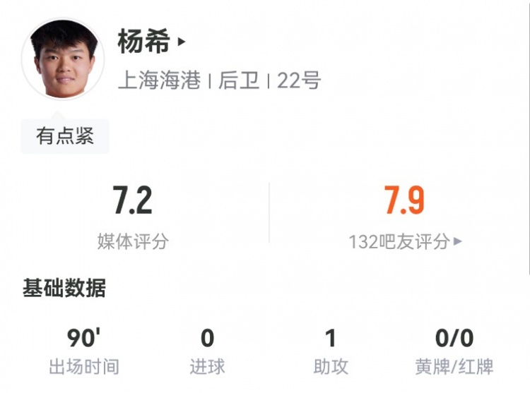 直播吧3月7日訊 中超第一輪,上海海港主場1-2河南隊(duì)。此役海港新援楊希首發(fā)打滿全場,球員全場重點(diǎn)數(shù)據(jù)如下↓