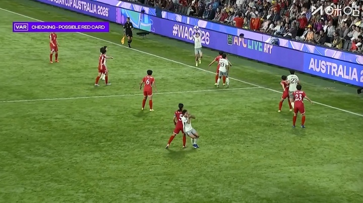 朝鮮女足球員肘擊王霜,裁判經(jīng)VAR介入后向?qū)Ψ匠鍪军S牌。