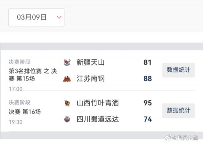 新疆天山 81-88 江蘇南鋼,江蘇女籃三人得分上雙,孫宇25分7籃板,許晨妍22分11籃板,王馨雨16分5籃板。新疆女籃四人得分上雙,武桐桐31分8助攻,王雪朦20分5籃板,耿夢(mèng)君12分,張慈源10分。