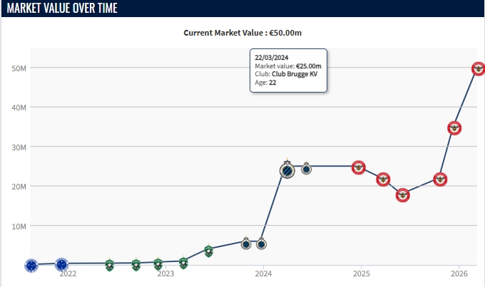 伊戈爾·蒂亞戈2024年以3300萬歐從布魯日轉會至布倫特福德,伊戈爾·蒂亞戈本賽季已經代表布倫特福德在英超打進18粒進球,射手榜上僅次于哈蘭德。目前身價已高達5000萬歐元!