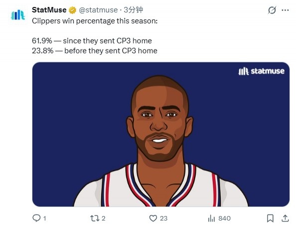 美媒曬出數(shù)據(jù),快船送走保羅前勝率23.8%,送走保羅之后的勝率為61.9%。