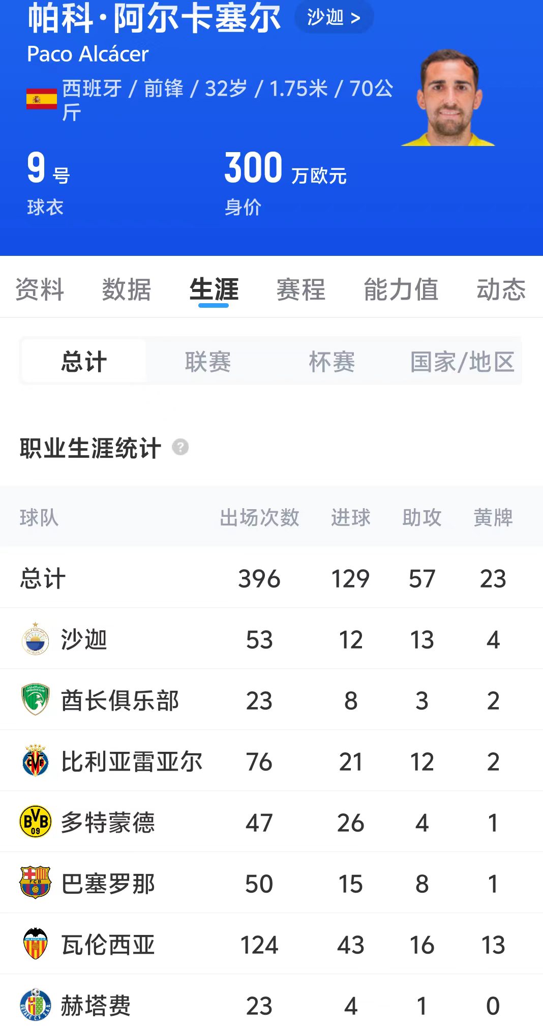 帕科職業(yè)生涯共出場396場比賽,打進129球,貢獻(xiàn)57次助攻。