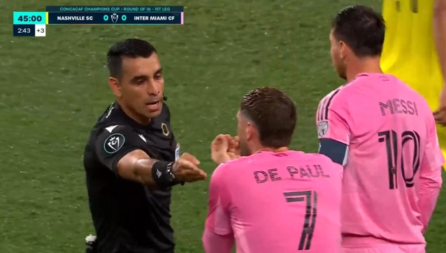 上半場補時,梅西連續(xù)盤帶后倒地,起身后梅西表示應該給牌。隨后德保羅也非常不滿。