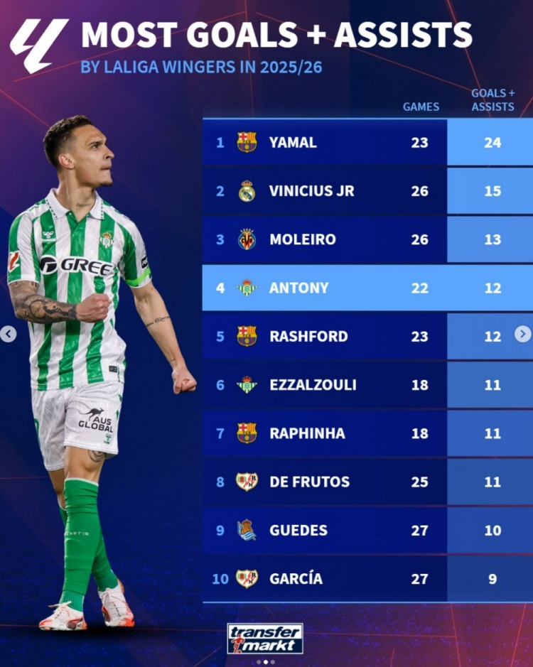 直播吧3月12日訊 德轉(zhuǎn)盤點了本賽季西甲邊鋒位置球員在聯(lián)賽中參與進球榜,其中亞馬爾居首,具體榜單如下(進球+助攻):