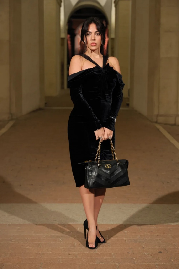32歲的喬治娜身著引人注目的黑色天鵝絨連衣裙,擺拍照片。裙長及膝,肩帶繞過肩膀。她搭配了黑色高跟鞋和黑色手包,完成了這身造型。