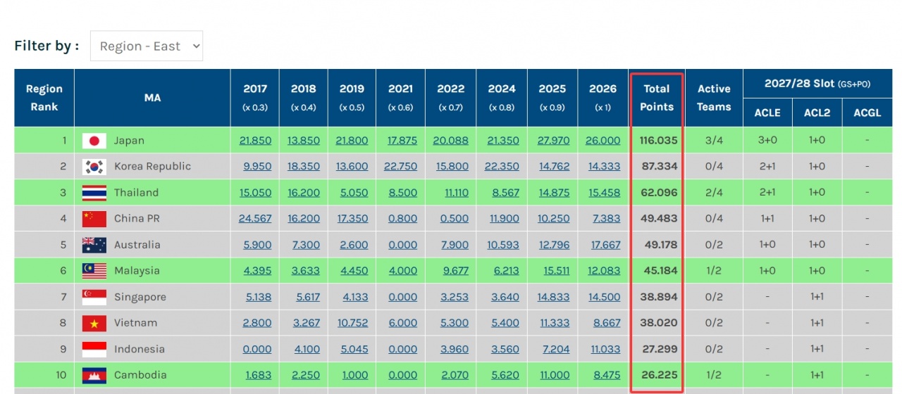 在今年2月份的時(shí)候,本賽季中超的亞冠技術(shù)積分排名東亞第9,但隨著柬埔寨球隊(duì)闖入亞挑聯(lián)的半決賽,中超的積分被超越,滑落至東亞第10。