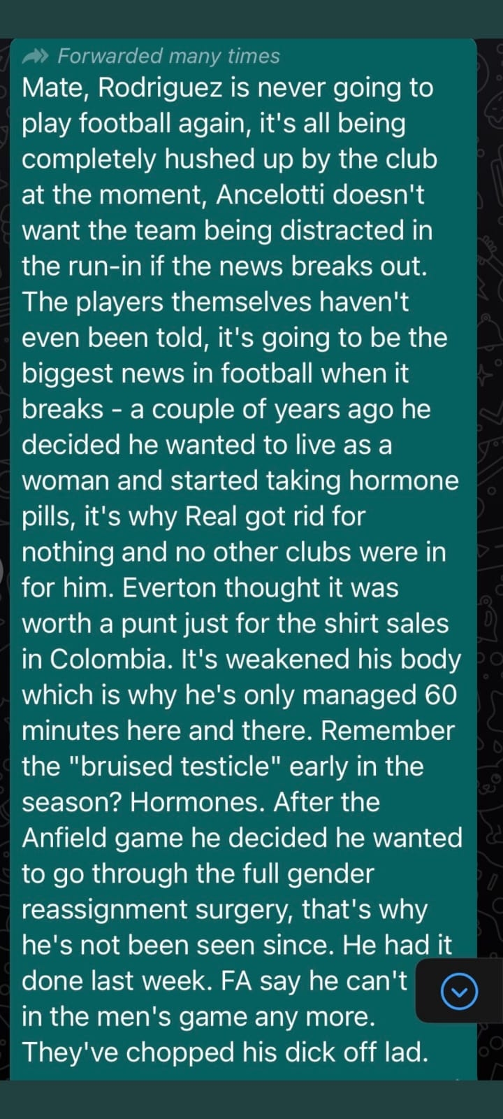 實(shí)際上,幾乎完全相同的謠言也曾出現(xiàn)在效力埃弗頓時(shí)的哥倫比亞球星J羅身上,并且文案也是出自同一模板。相關(guān)文字充滿著惡意誹謗,并且沒有任何媒體報(bào)道可以予以支撐,可以斷定又是一則典型的社媒謠言。