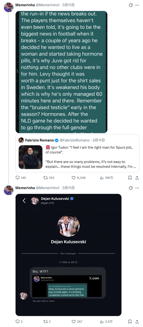 經(jīng)小編查證,該謠言出自社媒的一位惡搞博主,該博主擁有3000多的粉絲量,主頁(yè)常年充斥著關(guān)于熱刺的梗圖。他最近分享的這則有關(guān)庫(kù)盧的謠言吸引了超過160萬(wàn)的瀏覽量,內(nèi)容中聲稱“庫(kù)盧塞夫斯基再也無(wú)法踢足球”,原因是服用了激素類藥物,并且“于上周接受了變性手術(shù)”,還表示熱刺對(duì)此完全保密。