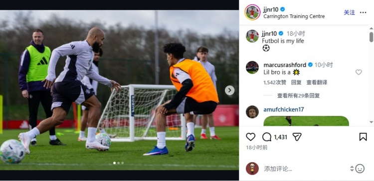 15歲的JJ·加布里埃爾是曼聯(lián)青訓最耀眼的新星,昨晚他在Instagram曬出自己跟隨一線隊訓練的照片,并寫道:“足球是我的生命。”