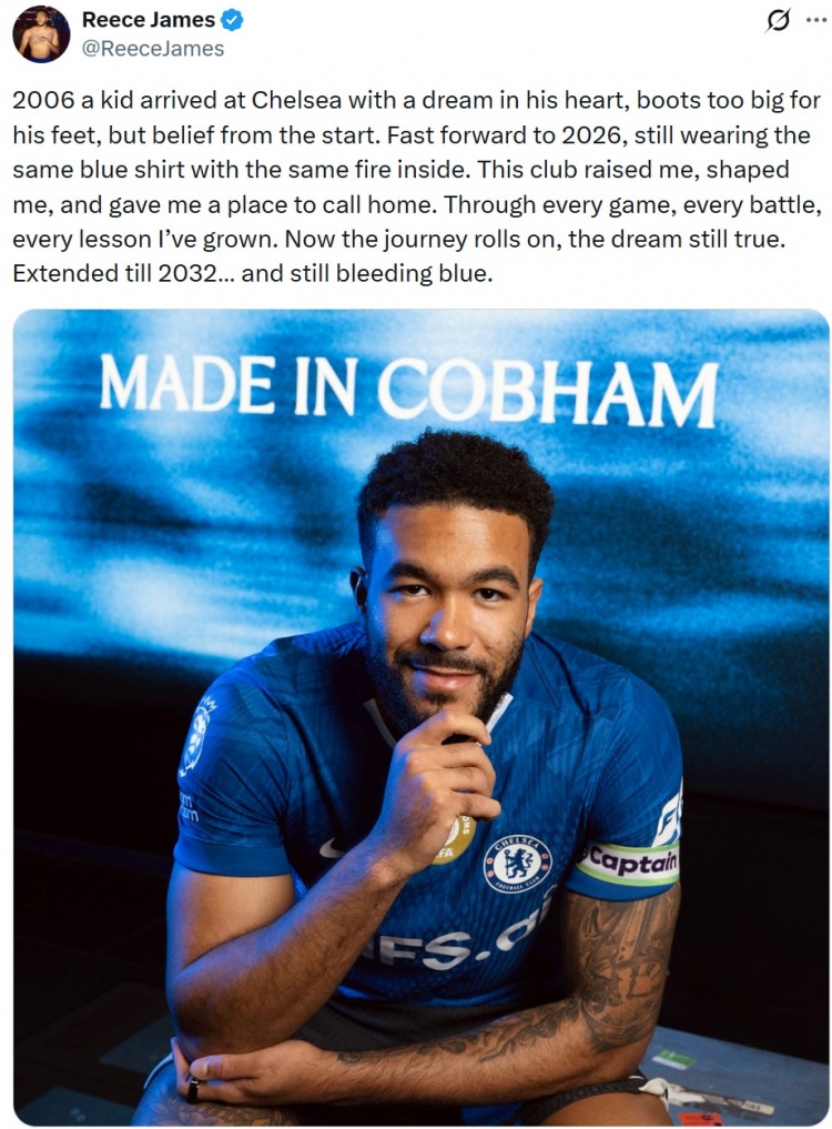 里斯·詹姆斯也在社媒發(fā)文寫道:“2006年,一個懷揣夢想的孩子來到了切爾西,腳上的球鞋對他來說太大,但從一開始他就充滿了信念。時光來到2026年,他依然穿著那件藍色球衣,內(nèi)心的熱情依舊如初。這個俱樂部養(yǎng)育了我,塑造了我,并給了我一個可以稱之為家的地方。在每一場比賽、每一次戰(zhàn)斗、每一次學(xué)習(xí)中,我都不斷成長。如今旅程仍在繼續(xù),夢想依舊未變。我與球隊合同延長至2032年……心中依舊流淌著藍色的血液?!?/span>
