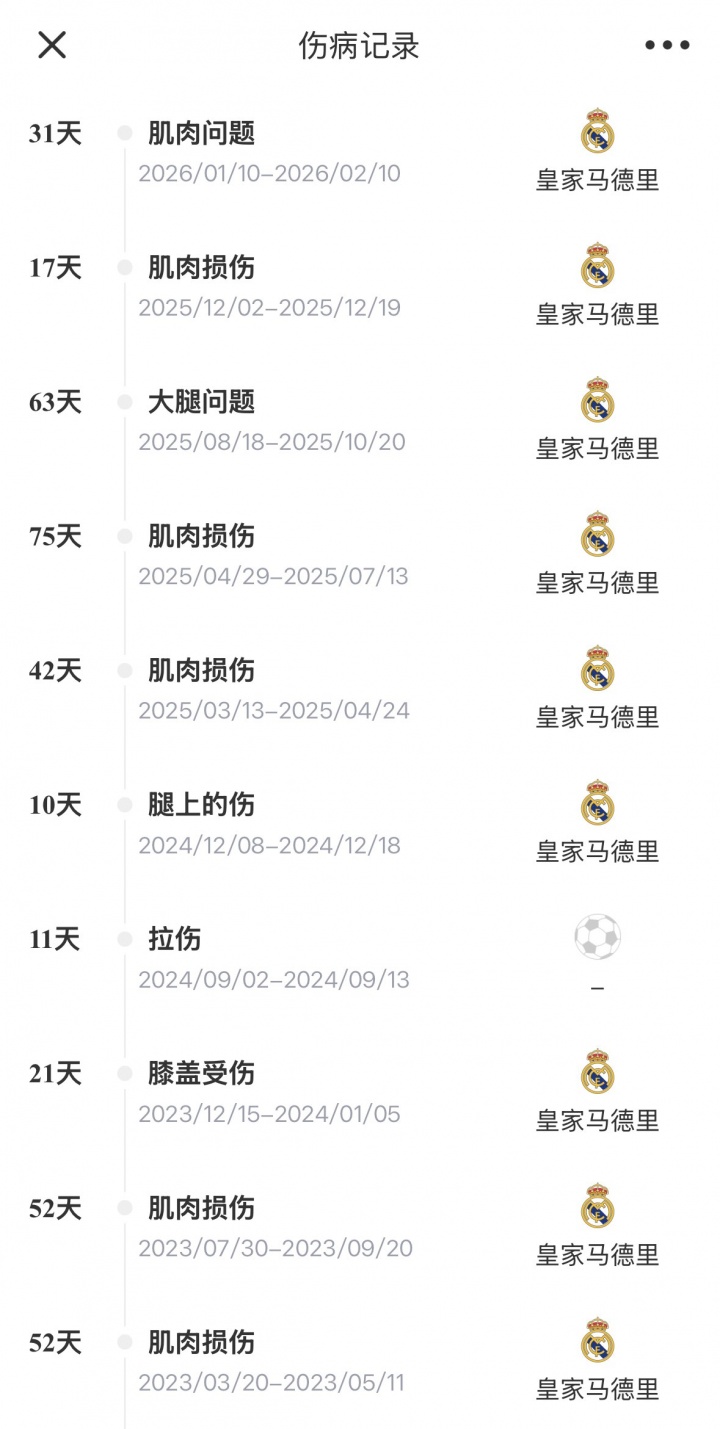 門迪本賽季已遭遇了4次傷病,大多都為肌肉問題,他本賽季僅為皇馬出場5次,共計(jì)247分鐘。他效力皇馬至今7個(gè)賽季遭遇了至少21次傷病。