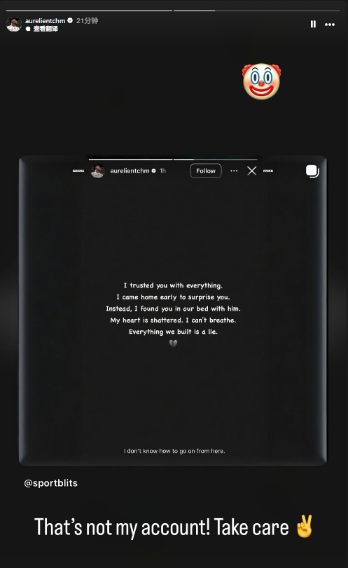 直播吧03月14日訊 今日凌晨X平臺有一位外網(wǎng)博主發(fā)布了一張疑似為(經(jīng)證實并非)瓊阿梅尼社媒快拍的截圖,內(nèi)容為瓊阿梅尼表示控訴女友出軌,自己將其捉奸在床。
