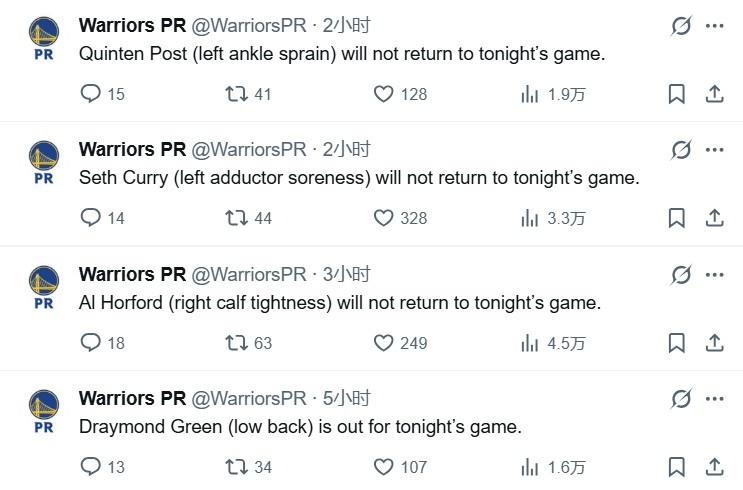 本場比賽勇士賽中三人傷退,分別是霍福德(左小腿肌肉)、小庫里(左腿內(nèi)收肌)和波斯特(左腳踝扭傷)。而在比賽開始前半個小時,追夢格林因?yàn)橄卤巢刻弁创_定缺陣。