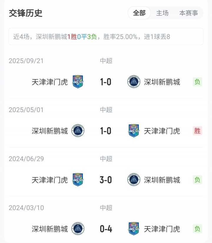中超首輪,深圳新鵬城1-5不敵成都蓉城,0分暫列中超第6;天津津門虎0-0戰(zhàn)平重慶銅梁龍,負(fù)9分暫列中超第16。上賽季兩隊(duì)交手各取一勝。