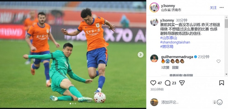 直播吧3月14日訊 泰山本輪主場戰(zhàn)勝國安,劉洋賽后更新社媒慶祝勝利。