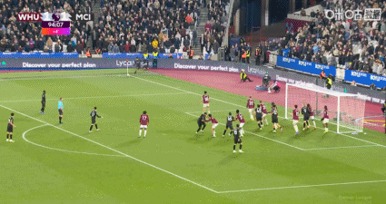 直播吧03月15日訊 英超曼城客戰(zhàn)西漢姆聯(lián),第94分鐘,曼城角球進攻引起禁區(qū)混戰(zhàn),格伊后點起腳射門打高!