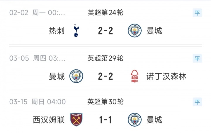 最近3次掉鏈子,曼城剛好是送給保級隊每隊1分,他們2-2戰(zhàn)平第16熱刺,2-2戰(zhàn)平第17森林,1-1戰(zhàn)平第18西漢姆。