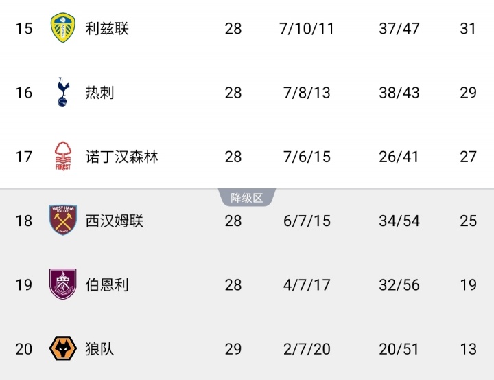 本輪英超,排名在熱刺后的球隊,除墊底狼隊外全部輸球,熱刺因此繼續(xù)領(lǐng)先降級區(qū)4分。