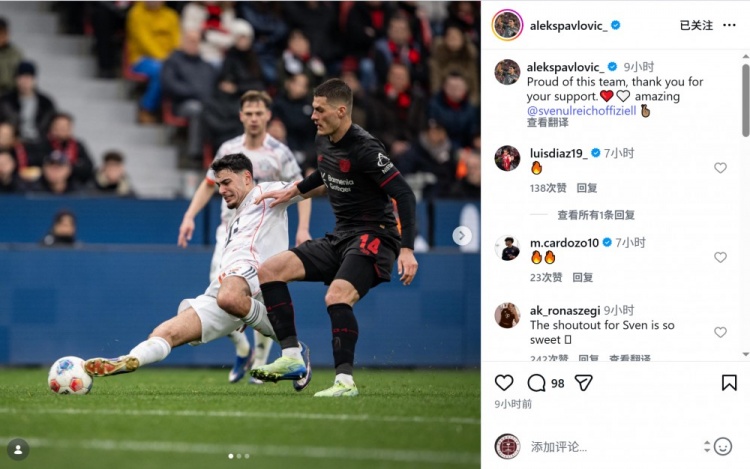 拜仁中場(chǎng)帕夫洛維奇社媒曬出比賽照片,配文:“為這支球隊(duì)感到驕傲,感謝你們的支持,烏爾賴希表現(xiàn)太棒了?!?/p>