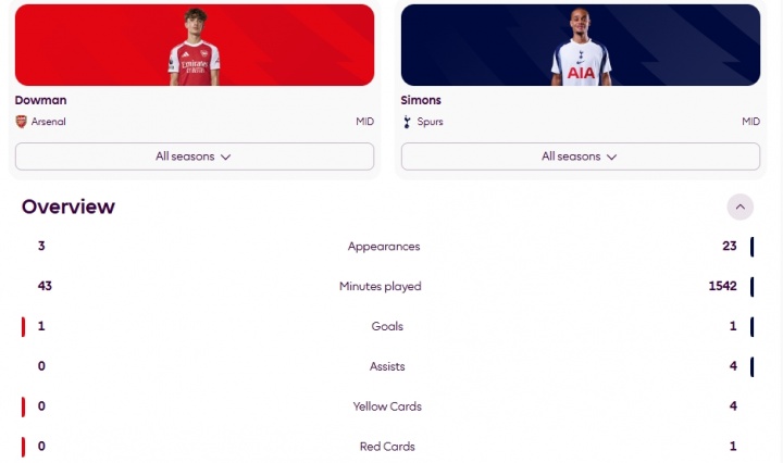 道曼本賽季只用了43分鐘便打進(jìn)英超首球,熱刺新援哈維·西蒙斯也只有一個英超進(jìn)球,但他已踢了23場出戰(zhàn)1542分鐘。