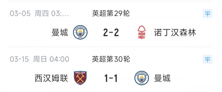 直播吧03月15日訊 英超第30輪比賽,曼城1-1戰(zhàn)平西漢姆,剛拿2月最佳主帥的瓜迪奧拉,3月份開局的兩戰(zhàn)兩連平。