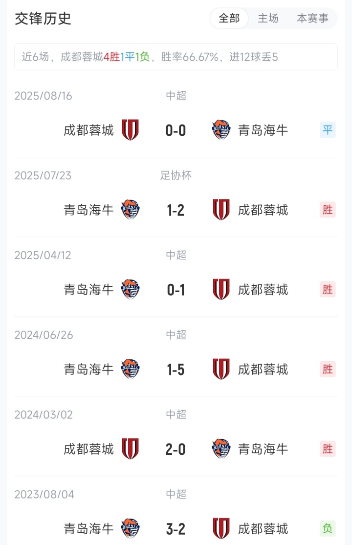 首輪比賽中,成都蓉城主場5-1大勝深圳新鵬城,3分暫居中超積分榜第2;青島海??蛨?-3負(fù)于云南玉昆,負(fù)7分暫居積分榜倒數(shù)第2。