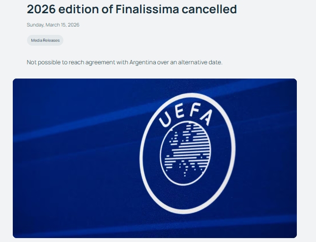直播吧03月15日訊 歐足聯(lián)官方宣布,原定于本月3月28日舉行的2026歐美杯比賽取消。