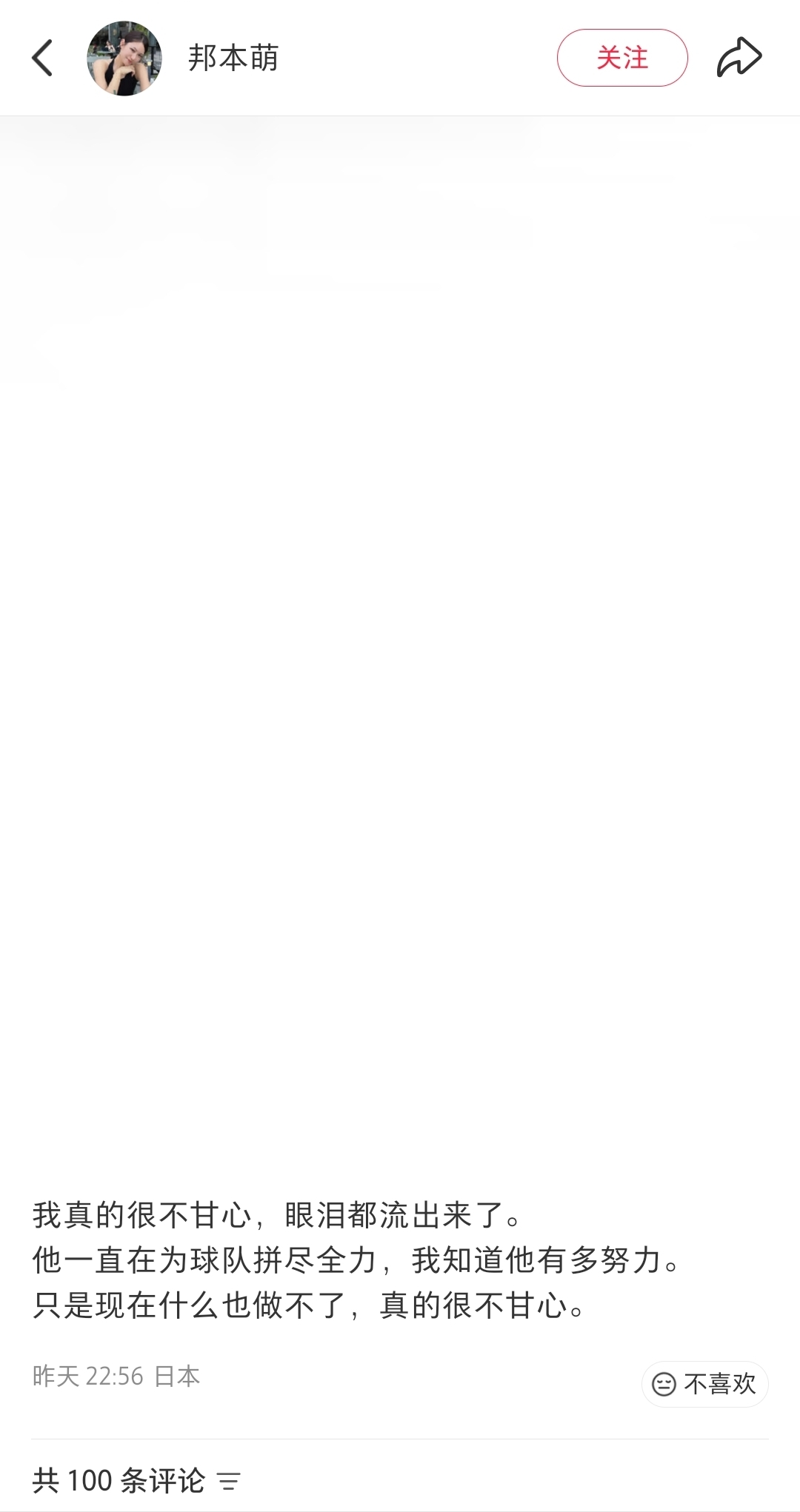 賽后邦本宜裕的妻子邦本萌發(fā)聲,表示:我真的很不甘心,眼淚都流出來(lái)了。他一直在為球隊(duì)拼盡全力,我知道他有多努力。只是現(xiàn)在什么也做不了,真的很不甘心。