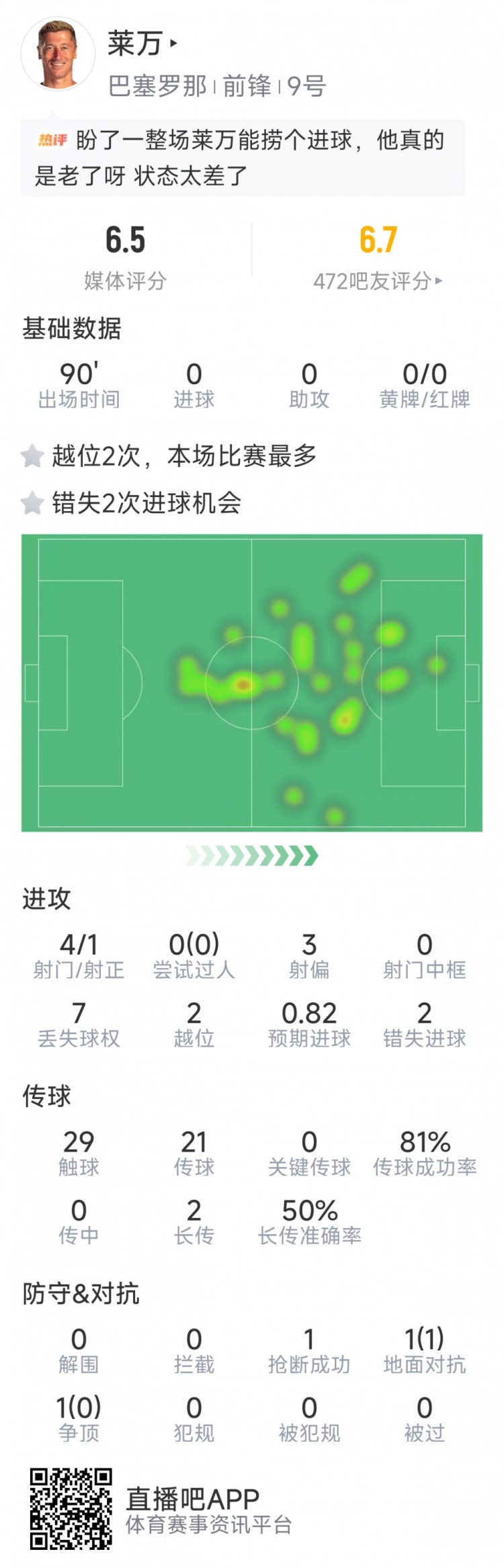 直播吧3月16日訊 在本輪西甲,巴薩5-2擊敗塞維利亞,以下為萊萬本場數(shù)據(jù):